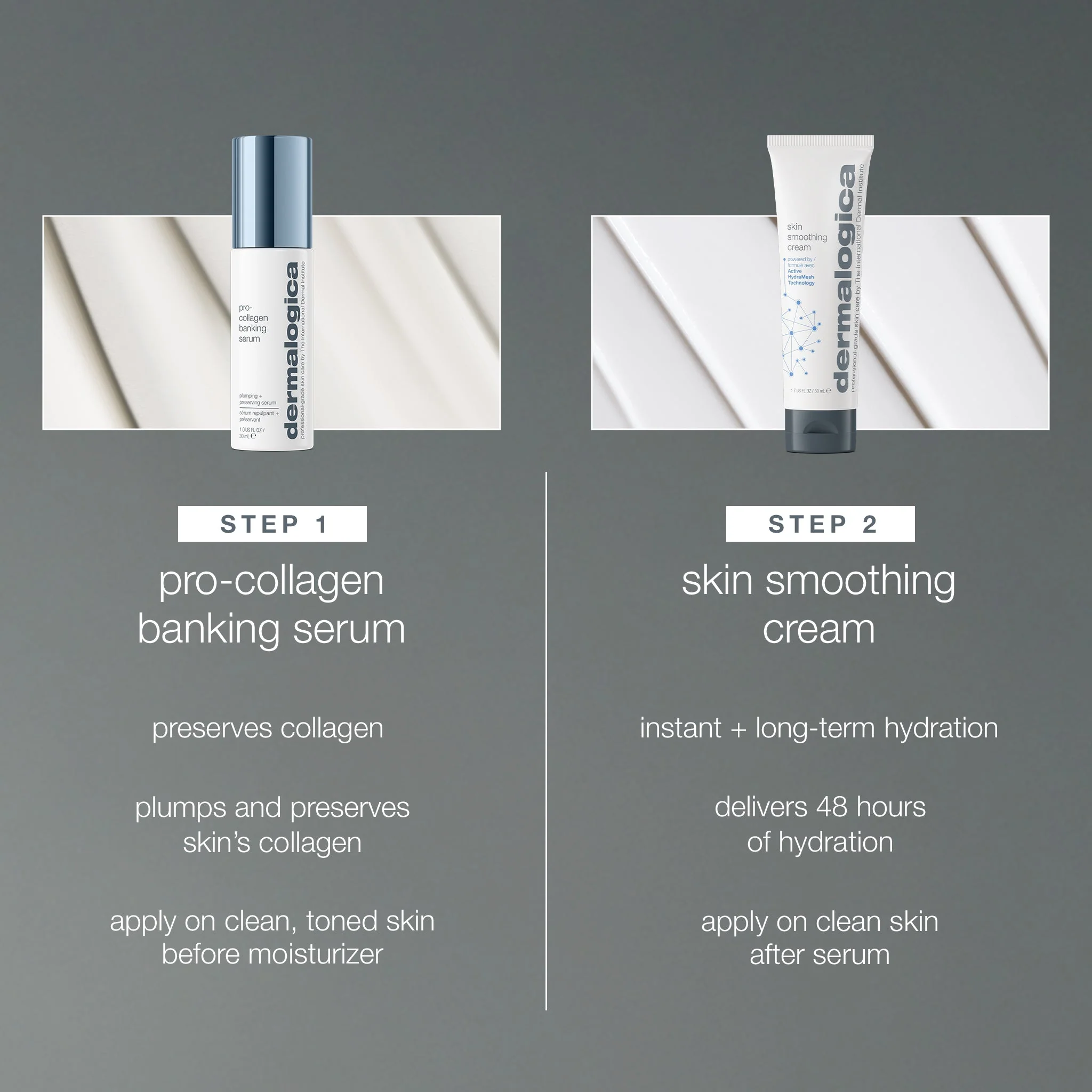 Experience the combined benefits of intense hydration and advanced collagen preservation for truly radiant skin. Skin Smoothing Cream provides 48 hours of continuous moisture with Active HydraMesh Technology , delivering intense hydration and enhancing skin texture. Pro Collagen Banking Serum plumps and preserves collagen, giving your skin a firmer and more resilient appearance.