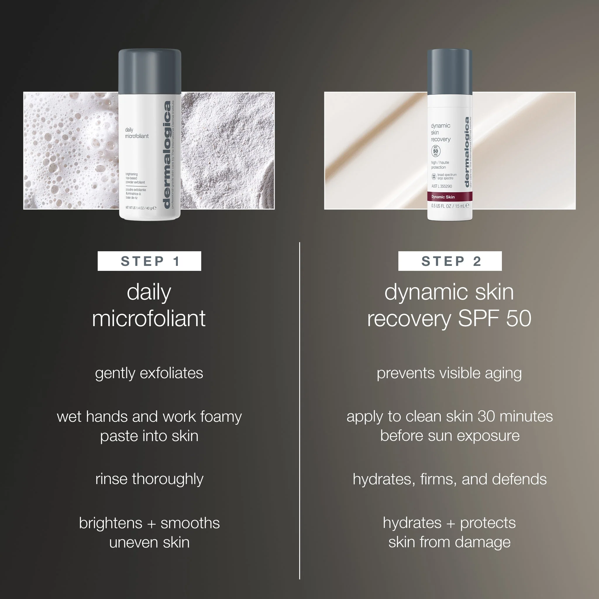 Transformative kit featuring our best selling Daily Microfoliant and Dynamic Skin Recovery SPF50. This perfect pairing delivers a double dose of skin health, starting with gentle yet powerful exfoliation and culminating in moisturization with sun protection for a visibly radiant and resilient complexion.
